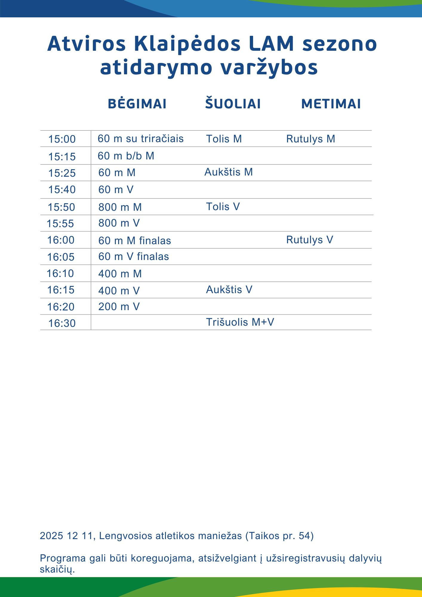 gruodžio 11 Atviros Klaipėdos lengvosios atletikos mokyklos žiemos sezono atidarymo varžybos Nuostatai (pakeisti gruodžio 4 d.) Pakoreguota programa