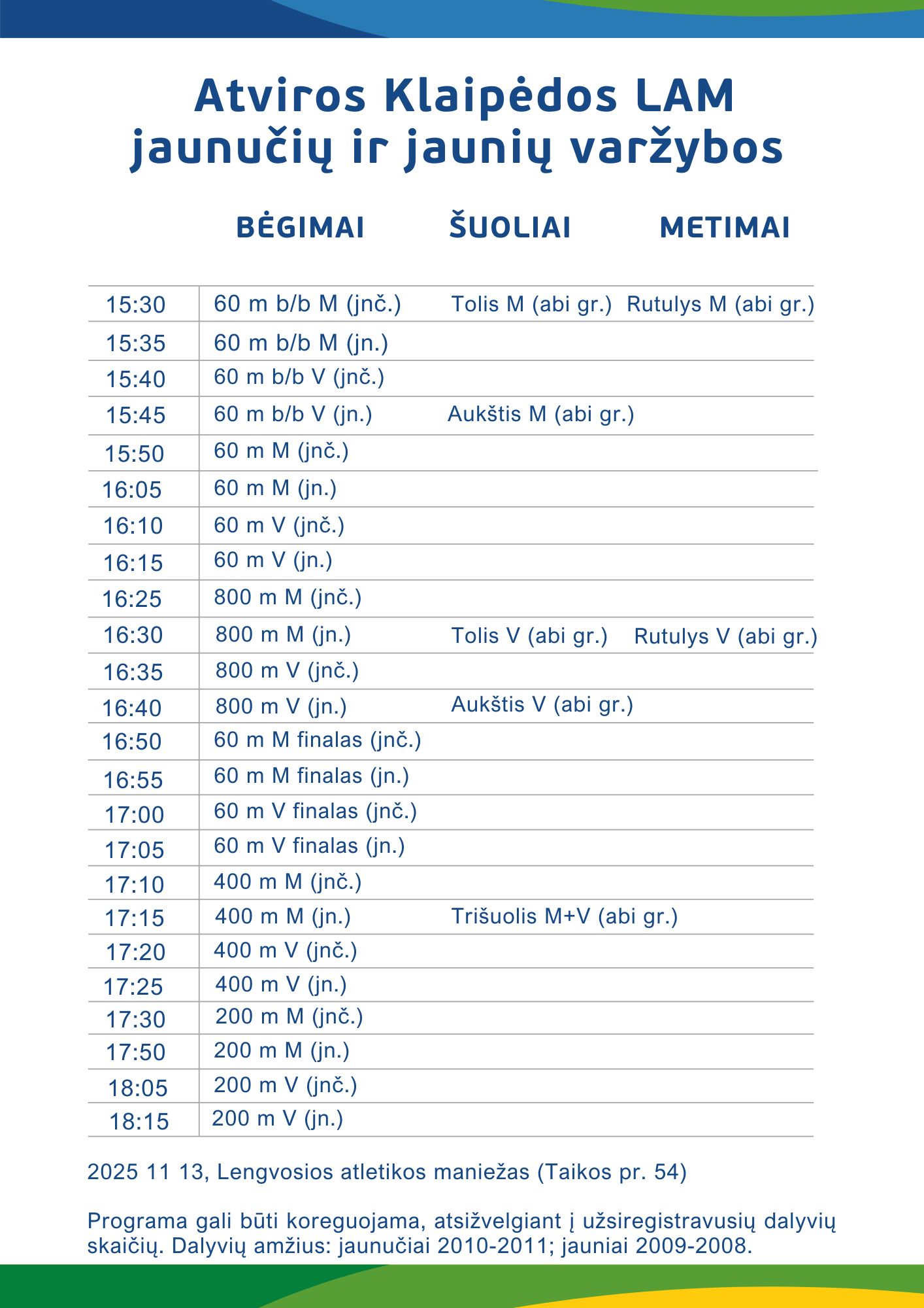 Atviros Klaipėdos lengvosios atletikos mokyklos jaunučių ir jaunių varžybos Ketvirtadienis, 13 lapkričio 2025 Paskelbtas Renginiai Nuostatai Pakoreguota programa Skaityti daugiau ...