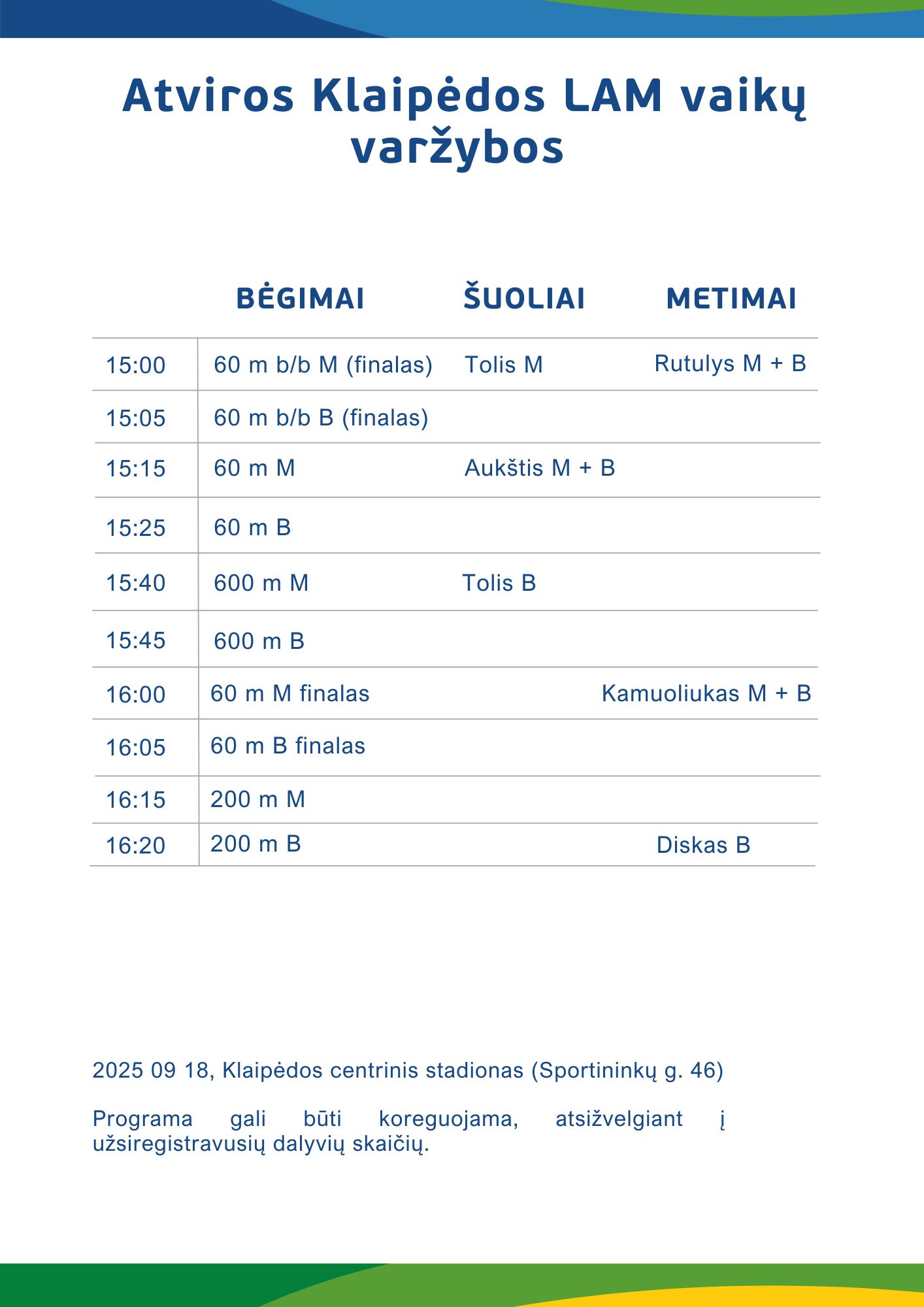 rugsėjo 18 Atviros Klaipėdos lengvosios atletikos mokyklos vaikų gim. 2012-2013 m. ir 2014 m. ir jaunesnių varžybos Nuostatai PATIKSLINTA PROGRAMA
